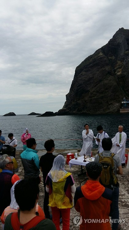 (독도=연합뉴스) 홍국기 기자 = 한국천주교회가 올해 광복 70주년을 기념해 17일 독도에서 첫 공식 미사를 열었다.