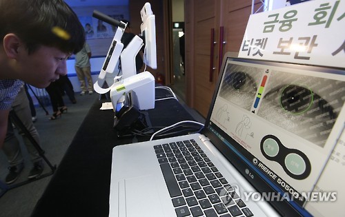 | △ 지난 7일 서울 종로구 창조경제혁신센터에서 열린 '창조경제 데모데이'에서 한 업체 관계자가 홍채 인식 금융거래 시스템을 시연하고 있다. (연합뉴스 자료사진) |