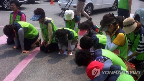 | △ 청주노인전문병원 노조원들이 지난 6월 15일 시청 브리핑실 입구 바닥에 무릎을 꿇은채 기자회견 뒤 퇴장하는 새정치민주연합 의원들을 향해 노인전문병원을 조속히 정상화시켜달라며 절규하고 있다. (연합뉴스 자료사진) |