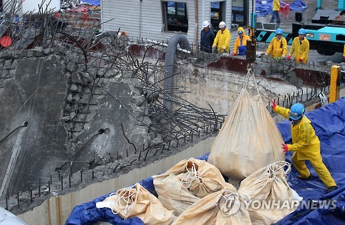 | △ 폭발사고 난 저장조 폐기물 제거 작업 (울산=연합뉴스) 김용태 기자 = 7일 오후 한화케미칼 울산2공장 폭발사고 현장에서 폭발이 일어난 폐수처리장 저장조에 가라앉은 폐기물 제거 작업이 진행되고 있다. 2015.7.7 yongtae@yna.co.kr |