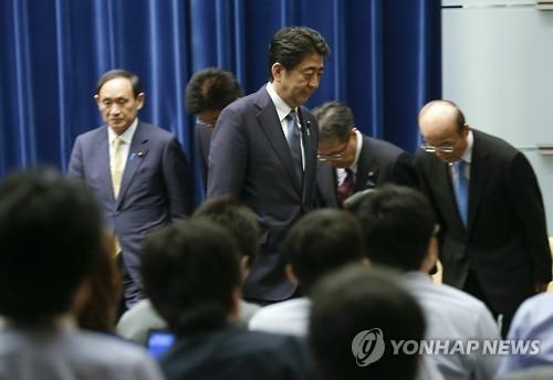 | △ 아베 신조 일본 총리가 2015년 8월 14일 아베 담화를 발표하는 기자회견을 마치고 총리관저 기자회견실을 떠나고 있다.(EPA=연합뉴스) |