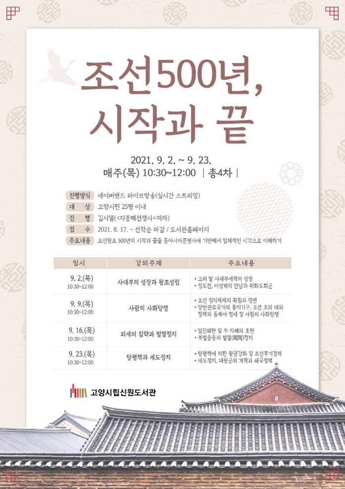 [부자동네타임즈 김인수기자] 고양시 신원도서관에서는 "오는 9월 2일부터 23일까지 매주 목요일 독서의 달 특별 인문학 강연‘조선500년, 시작과 끝’을 운영한다."고 밝혔다.