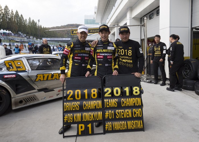 [사진설명] 2018시즌 팀 챔피언을 차지한 아트라스BX 모터스포츠의 야나기다 마사타카, 김종겸, 조항우(왼쪽부터)가 기념촬영을 하고 있다.