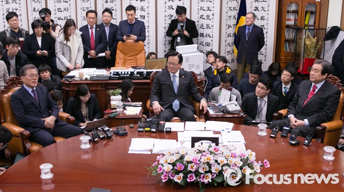 여야는 27일 선거구 획정에 대한 협상을 이어가기로 합의했다.(서울=포커스뉴스) 24일 오후 서울 여의도 국회에서 정의화(가운데) 국회의장과 김무성(오른쪽)·문재인 여야 대표가 선거구 획정에 대한 담판을 위해만나, 자리하고 있다. 2015.12.24 박철중 기자