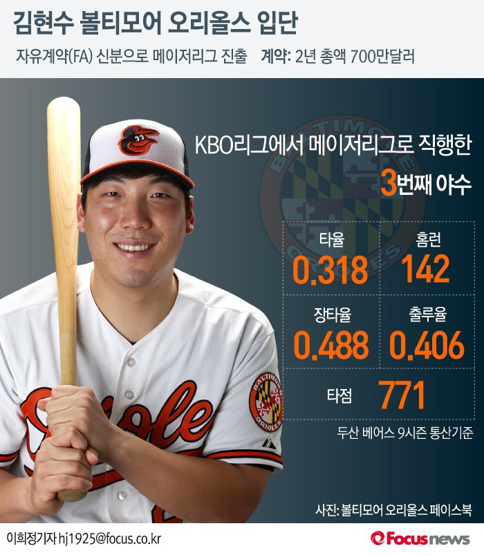 볼티모어 계약이 공식 발표되면서 김현수는 류현진(LA다저스) 강정호(피츠버그) 박병호(미네소타)에 이어 한국프로야구에서 메이저리그에 진출한 역대 네번째 선수가 됐다. 세번째 야수이자 유일한 외야수다. 프리에이전트(FA)로 메이저리그 진출한 첫번째 선수이기도 하다. 류현진, 강정호, 박병호는 모두 포스팅시스템을 통해 진출했고, 강정호와 박병호는 모두 내야수다.