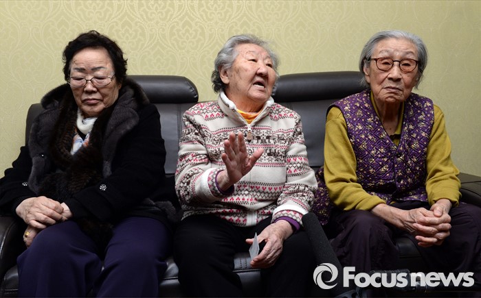 또 "할머니들 명예와 존엄을 어떻게 살리느냐가 제일 큰 문제"라며 "재단을 통해 돈을 드리는 것이 목적이 아니라 앞으로 할머니들이 겪은 고통, 인생 여정을 어떻게 잘 보존할 것인가를 위해 재단을 만드는 것“이라고 설명했다.29일 서울 마포구 연남동 정대협 쉼터에서 위안부 할머니들(왼쪽부터 이용수, 길원옥, 김복동)이 임성남 외교부 제1차관의 합의 설명을 듣고 입장을 밝히고 있다. 2015.12.29 김흥구 기자
