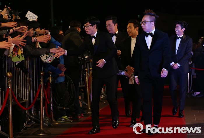 마무리는 웃음이었다. 유재석은 "대상 아닌가봐요"라고 너스레를 떨며 현장을 폭소케 했다. 'MBC연예대상'의 대상 후보에는 유재석, 박명수, 김구라, 김영철이 올랐다.(서울=포커스뉴스) 29일 오후 서울 마포구 MBC 미디어센터에서 열린 '2015 MBC 방송연예대상' 시상식에 참석한 무한도전의 멤버 유재석(왼쪽부터), 정준하, 하하, 박명수, 광희가 레드카펫위를 걷고 있다. 2015.12.29 김유근 기자