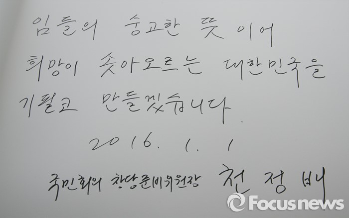 (서울=포커스뉴스) 병신년(丙申年) 새해 첫 날인 1일 오전 동작구 국립서울현충원에서 천정배 국민회의 창당추진위원장이 현충탑 참배했다. 사진은 천 위원장이 남긴 방명록.