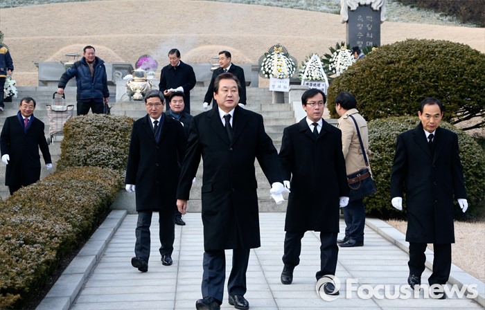 (서울=포커스뉴스) 병신년(丙申年) 새해 첫 날인 1일 오전 동작구 국립서울현충원에서 김무성 새누리당 대표가 박정희 전 대통령 묘역 참배를 마친 뒤 이동하고 있다.