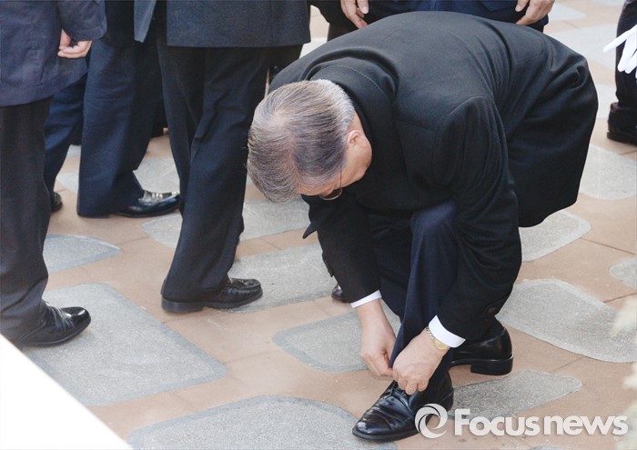 (서울=포커스뉴스) 병신년(丙申年) 새해 첫 날인 1일 오전 동작구 국립서울현충원에서 문재인 더불어민주당 대표가 김대중 전 대통령 묘역 참배를 마친 뒤 신발끈을 고쳐매고 있다.