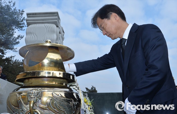(서울=포커스뉴스) 병신년(丙申年) 새해 첫 날인 1일 오전 동작구 국립서울현충원에서 천정배 국민회의 창당준비위원장이 김대중 전 대통령 묘역 참배를 하고 있다.