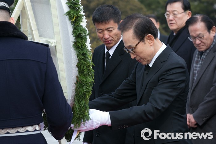 (서울=포커스뉴스) 병신년(丙申年) 새해 첫 날인 1일 오전 동작구 국립서울현충원에서 이명박 전 대통령이 현충탑 참배를 하고 있다.
