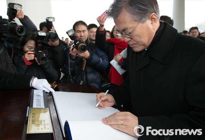 (서울=포커스뉴스) 병신년(丙申年) 새해 첫 날인 1일 오전 동작구 국립서울현충원에서 문재인 더불어민주당 대표가 현충탑 참배를 마친 뒤 방명록을 작성하고 있다.