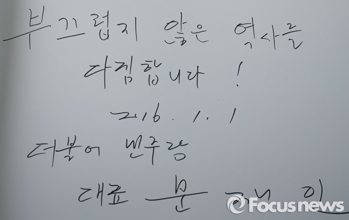 (서울=포커스뉴스) 병신년(丙申年) 새해 첫 날인 1일 오전 동작구 국립서울현충원에서 문재인 더불어민주당 대표가 현충탑 참배를 했다. 사진은 문 대표가 남긴 방명록.