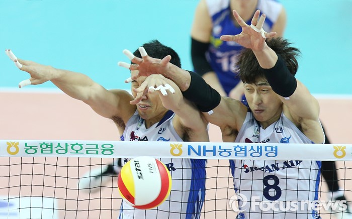 (인천=포커스뉴스) 3일 인천 계양체육관에서 열린 '2015-2016NH농협 V-리그' 남자부 대한항공-삼성화재 경기에서 대한항공 김형우(15)와 김학민이 블로킹을 성공하고 있다.