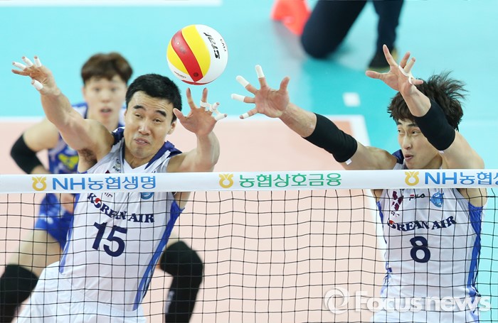 (인천=포커스뉴스) 3일 인천 계양체육관에서 열린 '2015-2016NH농협 V-리그' 남자부 대한항공-삼성화재 경기에서 대한항공 김형우(15)와 김학민이 블로킹을 성공하고 있다.