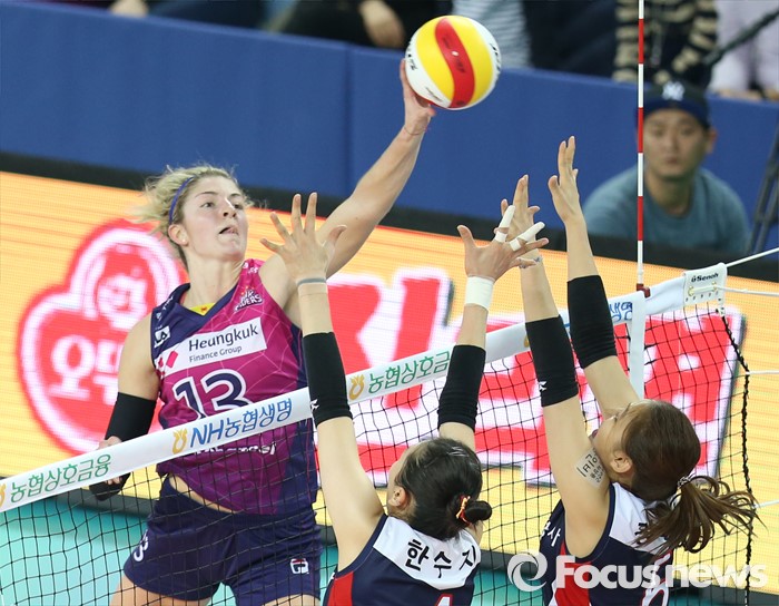 (인천=포커스뉴스) 3일 인천 계양체육관에서 열린 '2015-2016NH농협 V-리그' 여자부 흥국생명-KGC인삼공사 경기에서 흥국생명 테일러가 KGC인삼공사 한수지와 장영은의 블로킹을 앞에 두고 왼손 연타로 넘기고 있다.