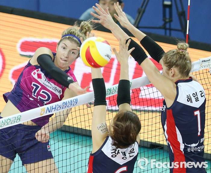 (인천=포커스뉴스) 3일 인천 계양체육관에서 열린 '2015-2016NH농협 V-리그' 여자부 흥국생명-KGC인삼공사 경기에서 흥국생명 테일러가 KGC인삼공사 장영은, 헤일리의 블로킹을 뚫는 스파이크를 날리고 있다.