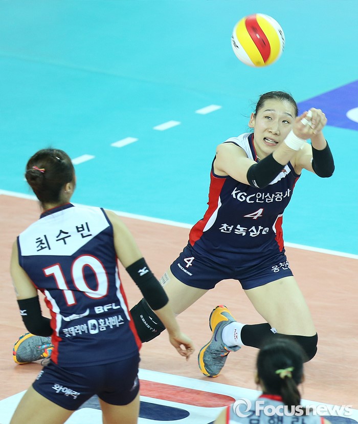 (인천=포커스뉴스) 3일 인천 계양체육관에서 열린 '2015-2016NH농협 V-리그' 여자부 흥국생명-KGC인삼공사 경기에서 KGC인삼공사 한수지가 블로킹에 맞고 떨어지는 공을 살리고 있다.