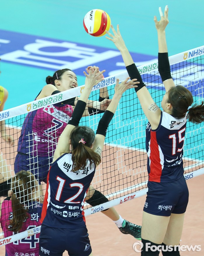 (인천=포커스뉴스) 3일 인천 계양체육관에서 열린 '2015-2016NH농협 V-리그' 여자부 흥국생명-KGC인삼공사 경기에서 흥국생명 김혜진이 속공을 시도하다 KGC인삼공사 백목화, 문명화의 블로킹에 걸리고 있다.