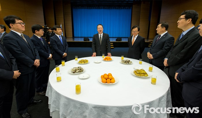 (서울=포커스뉴스) 박용만 대한상공회의소 회장이 4일 오전 서울 중구 대한상공회의소에서 열린 신녀인사회에 자리해 신년사를 마친 뒤 주요 임직원들과 대화를 나누고 있다.