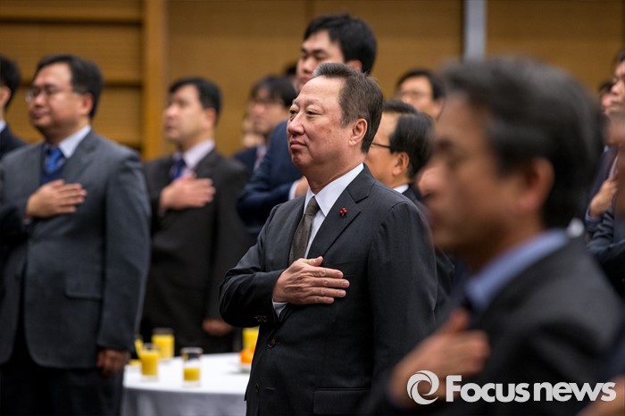 (서울=포커스뉴스) 박용만 대한상공회의소 회장이 4일 오전 서울 중구 대한상공회의소에서 열린 신녀인사회에 자리해 국민의례를 하고 있다.
