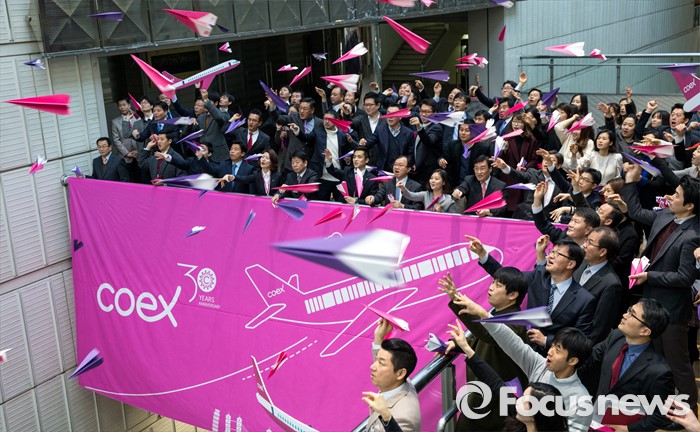 (서울=포커스뉴스) 4일 오전 서울 강남구 코엑스에서 열린 30주년 이색 시무식에 참석한 코엑스 임직원들이 종이비행기를 날리며 한 해의 힘찬 시작을 알리고 있다.