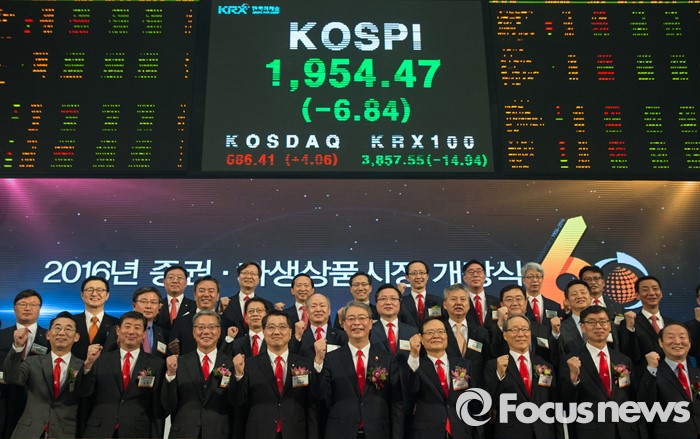 (서울=포커스뉴스) 병신년(丙申年) 새해 첫 증시 개장일인 4일 오전 영등포구 서울 여의도 거래소 2016년도 증권·파생상품시장 60주년 개장식에서 김군호 코넥스협회장, 김준 (주)경방 대표이사, 황영기 금융투자협회장, 진웅섭 금융감독원장, 임종룡 위원장, 최경수 한국거래소 이사장, 정구용 상장회사협의회장, 신경철 코스닥협회(맨 앞 왼쪽부터)이 화이팅을 외치고 있다.