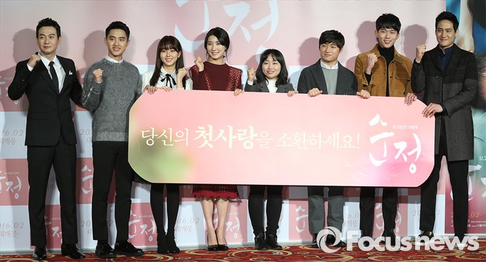 (서울=포커스뉴스) 4일 오전 서울 광진구 롯데시네마 건대입구점에서 열린 영화 '순정' 제작보고회에 자리한 출연배우 및 감독이 사진촬영을 하고 있다. 왼쪽부터 배우 박용우, 도경수, 김소현, 주다영, 이은희 감독, 이다윗, 연준석, 박해준.