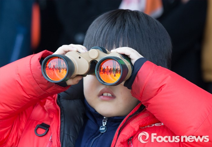 (논산=포커스뉴스) 4일 오후 충남 논산 육군훈련소 입영심사대에서 입영장병의 가족들이 망원경으로 바라보고 있다.