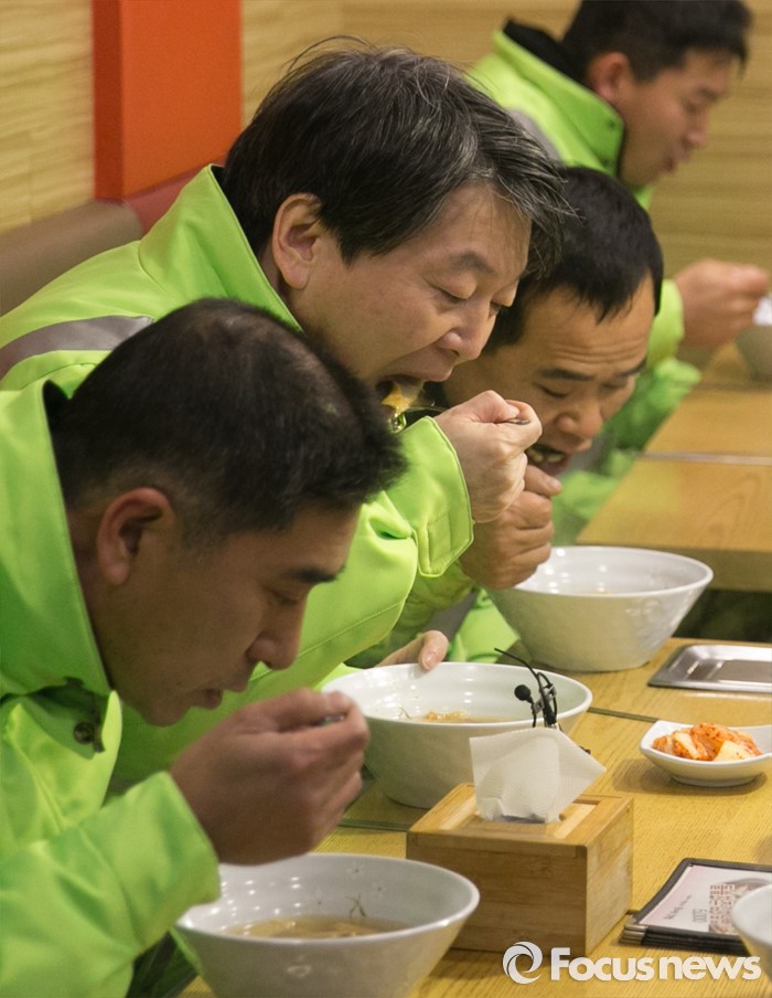 (서울=포커스뉴스) 신당 창당을 추진 중인 안철수 무소속 의원이 5일 오전 서울 영등포역 동부광장 인근에서 환경미화원들과 함께 새해맞이 청소를 마친 뒤 분식집에서 어묵탕 식사를 하고 있다.