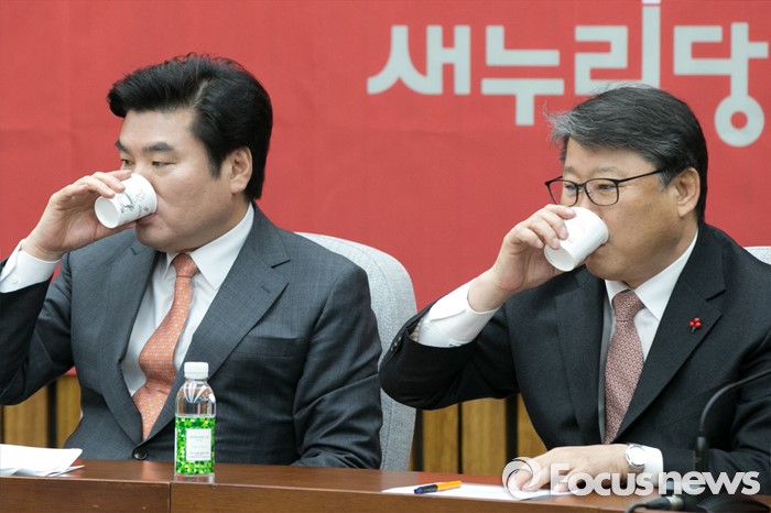 (서울=포커스뉴스) 원유철(왼쪽) 새누리당 원내대표와 조원진 원내수석부대표가 5일 오전 서울 여의도 국회에서 열린 원내대책회의에 참석해 물을 마시고 있다.