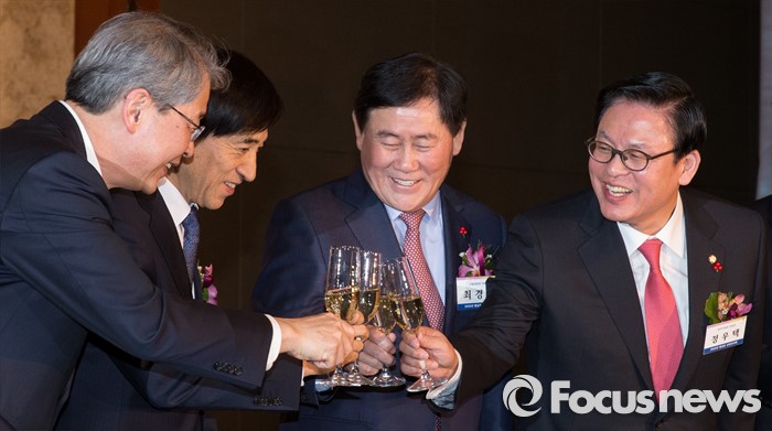 (서울=포커스뉴스) 5일 오후 서울 중구 롯데호텔에서 열린 '2016년 범금융 신년인사회'에 임종룡(왼쪽부터) 금융위원장, 이주열 한국은행 총재, 최경환 경제부총리 겸 기획재정부 장관, 정우택 국회 정무위원장이 건배를 하고 있다.