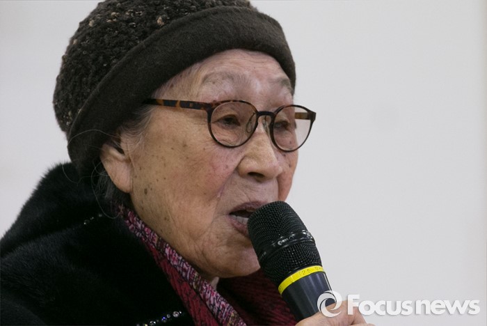 (서울=포커스뉴스) 5일 오후 서울 여의도 국회 의원회관에서 민주사회를 위한 변호사모임, 한국정신대문제대책협의회 등 주최로 열린 긴급진단, 2015년 한일 외교 장관 회담의 문제점 토론회에 참석한 위안부 피해자 김복동 할머니가 회담을 인정할 수 없는 이유에 대해 발언하고 있다.