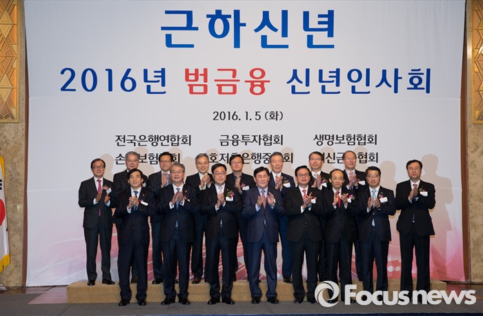 (서울=포커스뉴스) 5일 오후 서울 중구 롯데호텔에서 열린 '2016년 범금융 신년인사회'에서 이주열(앞줄 왼쪽부터) 한국은행 총재, 임종룡 금융위원장, 김기식 정무위원회 간사, 최경환 경제부총리 겸 기획재정부 장관, 정우택 국회 정무위원장을 비롯한 참석자들이 기념촬영을 하고 있다.