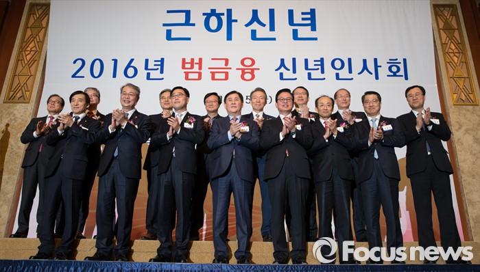 (서울=포커스뉴스) 5일 오후 서울 중구 롯데호텔에서 열린 '2016년 범금융 신년인사회'에서 이주열(앞줄 왼쪽부터) 한국은행 총재, 임종룡 금융위원장, 김기식 정무위원회 간사, 최경환 경제부총리 겸 기획재정부 장관, 정우택 국회 정무위원장을 비롯한 참석자들이 기념촬영을 하고 있다.