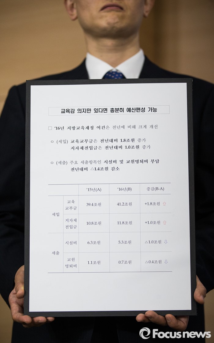 (서울=포커스뉴스) 최경환 부총리겸 기획재정부장관이 5일 오후 종로구 서울정부청사에서 누리과정 관련 긴급 관계부처 합동브리핑을 하고있는 가운데 기자들에게 2016년 지방교육재정표를 보여주고 있다.