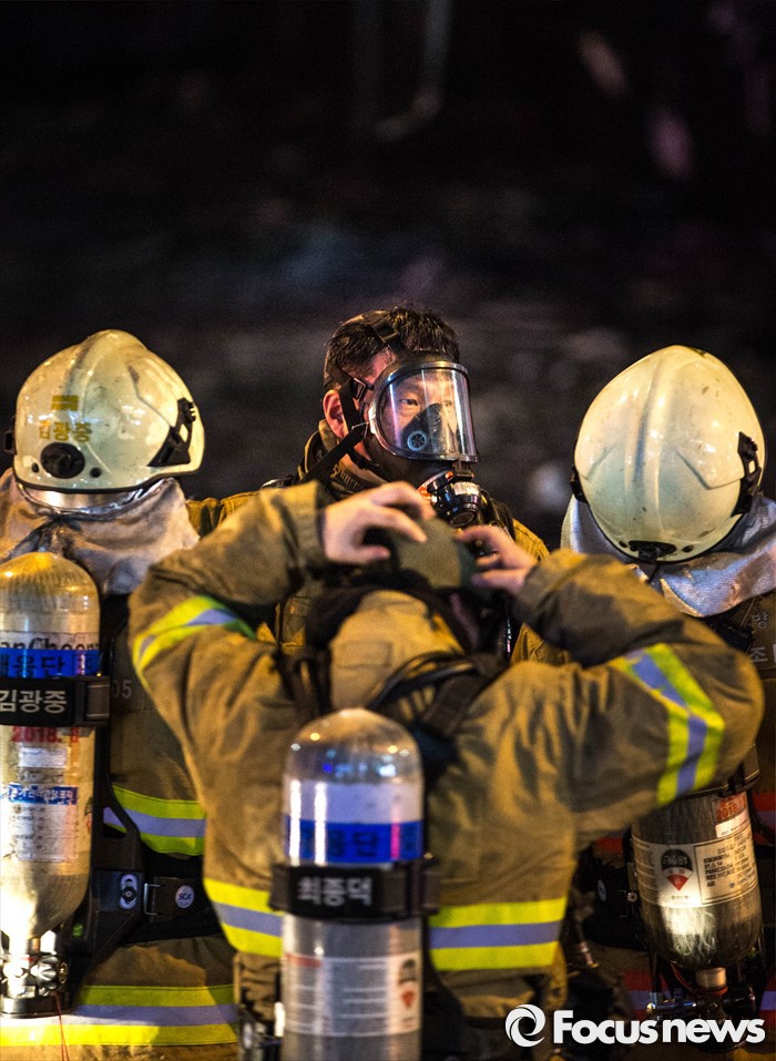 | △ 분당 화재현장, 진입 준비하는 소방관들 |
