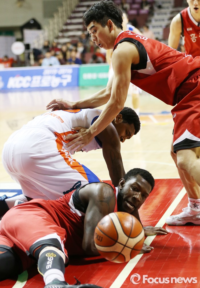 (안양=포커스뉴스) 5일 안양실내체육관에서 열린 2015-2016 프로농구 KGC-전자랜드 경기에서 KGC 마리오 리틀과 전자랜드 포웰이 리바운드 다툼을 하다 넘어져서도 볼에 대한 집념을 보이고 있다.