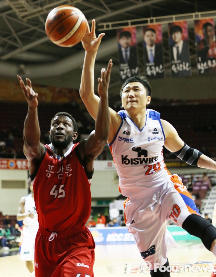 (안양=포커스뉴스) 5일 안양실내체육관에서 열린 2015-2016 프로농구 KGC-전자랜드 경기에서 전자랜드 정영삼과 KGC 마리오 리틀이 리바운드볼을 다투고 있다.