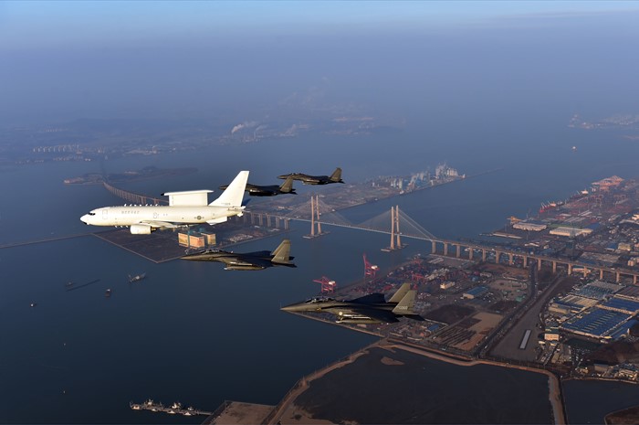 (서울=포커스뉴스) 공군 E-737 피스아이와 F-15K 편대가 본격적인 서해안 시대를 연 서해안고속도로와 서해대교 상공을 초계비행하는 모습. <사진제공=공군>