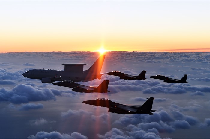 (서울=포커스뉴스) 공군 E-737 피스아이(선두)와 F-15K 편대가 대한민국의 동해안 호미곶 상공에서 일출을 맞이하고 있다. <사진제공=공군>