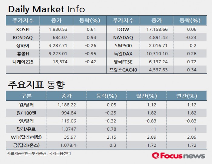 △미국증시는 중국증시 안정화에도 유가 하락 등에 혼조세를 나타냈다.
