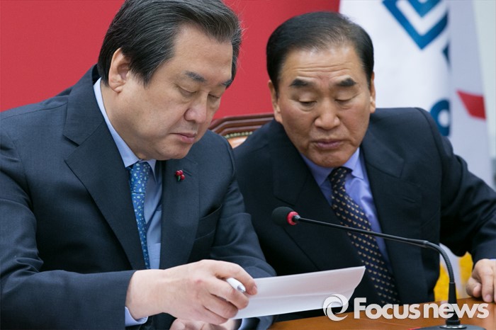 (서울=포커스뉴스) 김무성(왼쪽) 새누리당 대표와 이재오 의원이 6일 오전 서울 여의도 국회에서 열린 최고중진연석회의에 참석해 대화하고 있다.