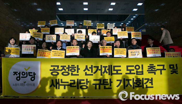 (서울=포커스뉴스) 6일 오전 서울 여의도 국회 로텐더홀 계단에서 심상정 정의당 상임대표 등 지도부 및 의원단이 공정한 선거제도 도입 촉구 및 새누리당 규탄 기자회견을 하고 있다.