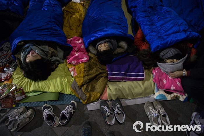 (서울=포커스뉴스) 세계 최장기 집회, 24주년 수요집회가 열리는6일 오전 서울 종로구 위안부 소녀상 앞 기온은 영하 4도, 강추위에 소녀상 이전을 반대하는 대학생들이 길바닥에서 잠을 자고 있다.