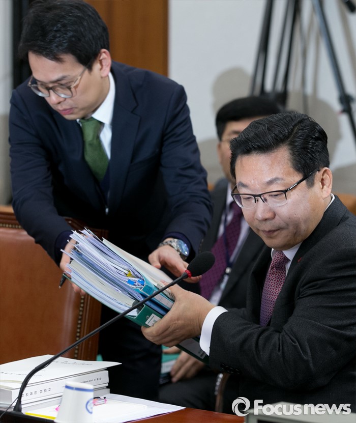 (서울=포커스뉴스) 주형환 산업통상자원부 장관 후보자가 6일 오전 서울 여의도 국회에서 열린 인사청문회에 참석해 자료를 전달받고 있다.