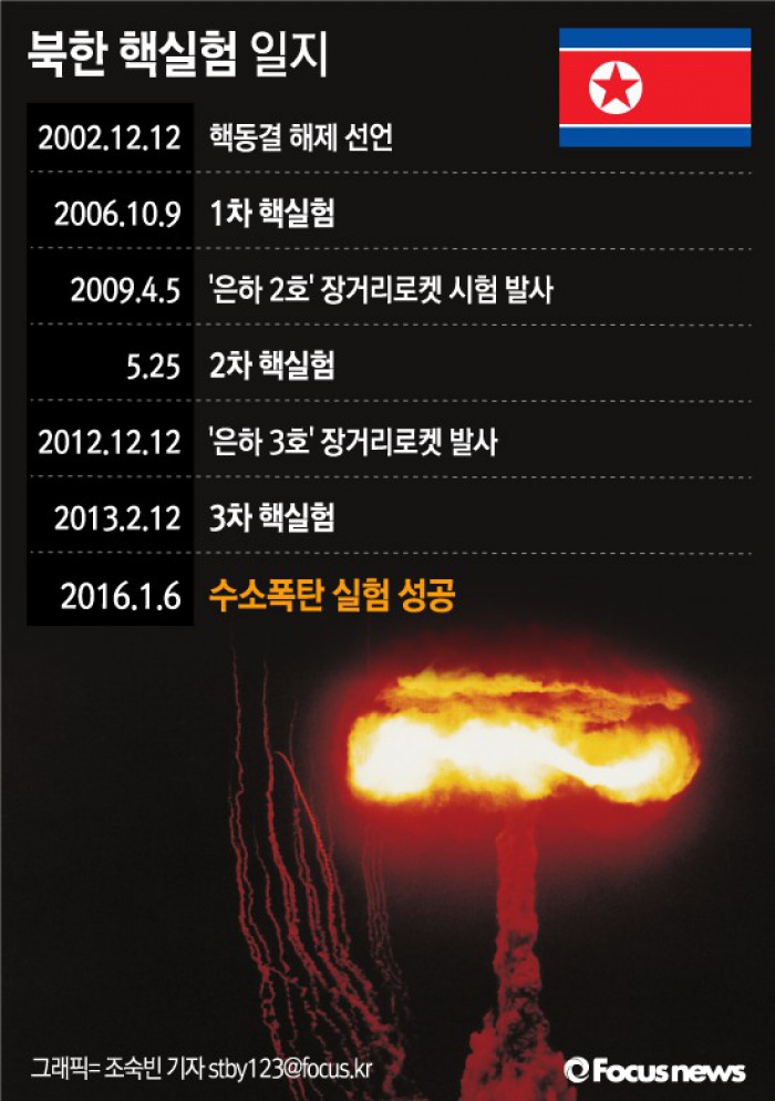 (서울=포커스뉴스) 북한이 6일 수소탄 실험에 성공했다고 밝혔다. 북한 조선중앙TV는 이날 오후 12시30분 '주체조선의 첫 수소탄시험 완전성공'을 방송하며 "주체조선의 첫 수소탄 실험이 완전 성공했다"고 했다.