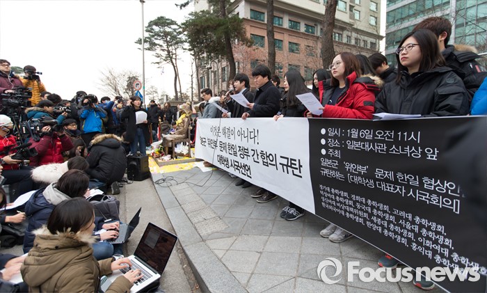 (서울=포커스뉴스) 6일 오전 서울 종로구 구 일본대사관 앞에서 대학생 대표자들이 일본군 위안부 문제 한일 정부간 합의 규탄 시국선언을 하고 있다.