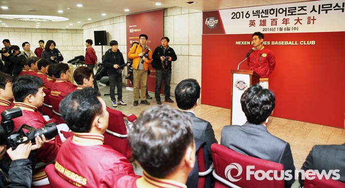 (서울=포커스뉴스) 6일 목동구장에서 열린 프로야구 2016 넥센 히어로즈 시무식에서 염경엽 감독이 새해의 선전을 다짐하는 인삿말을 하고 있다.